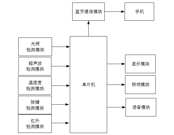 通过对视力保护台灯的功能进行分析,在此将整个系统架构如图2-1所示为系统设计框图,系统采用STM32单片机作为主控模块,通过HC-SR04模块实现超声波测距、DHT11传感器实现人体检测、光敏电阻实现光照检测、红外传感器检测是否有人、JDY-31蓝牙模块实现与手机APP的通信、JQ8400实现语音播报、OLED12864液晶实现数据显示功能。