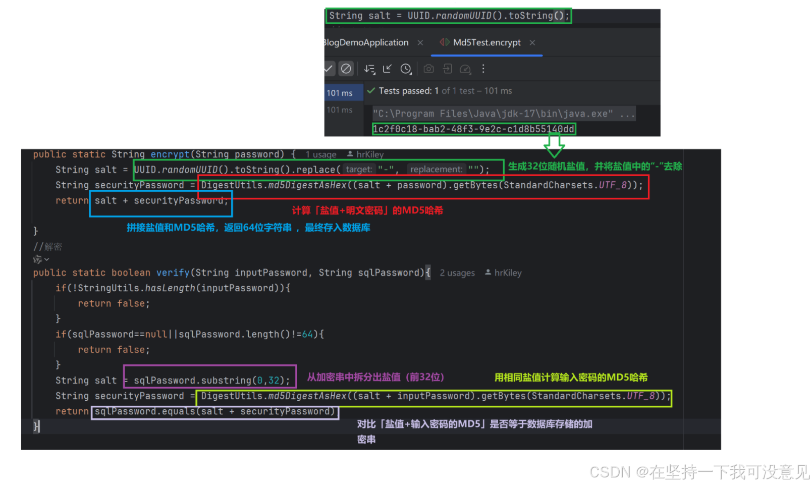 MD5本身是不可逆的,加上相同的密码经过MD5哈希之后的密⽂是相同的,就很有可能被破解,但是我们可以采⽤为⼀个密码拼接⼀个随机字符来进⾏加密,这个随机字符我们称之为 "盐",这样子即使黑客拿到数据库的数据,也是加密后字符串和盐的组合的字符串