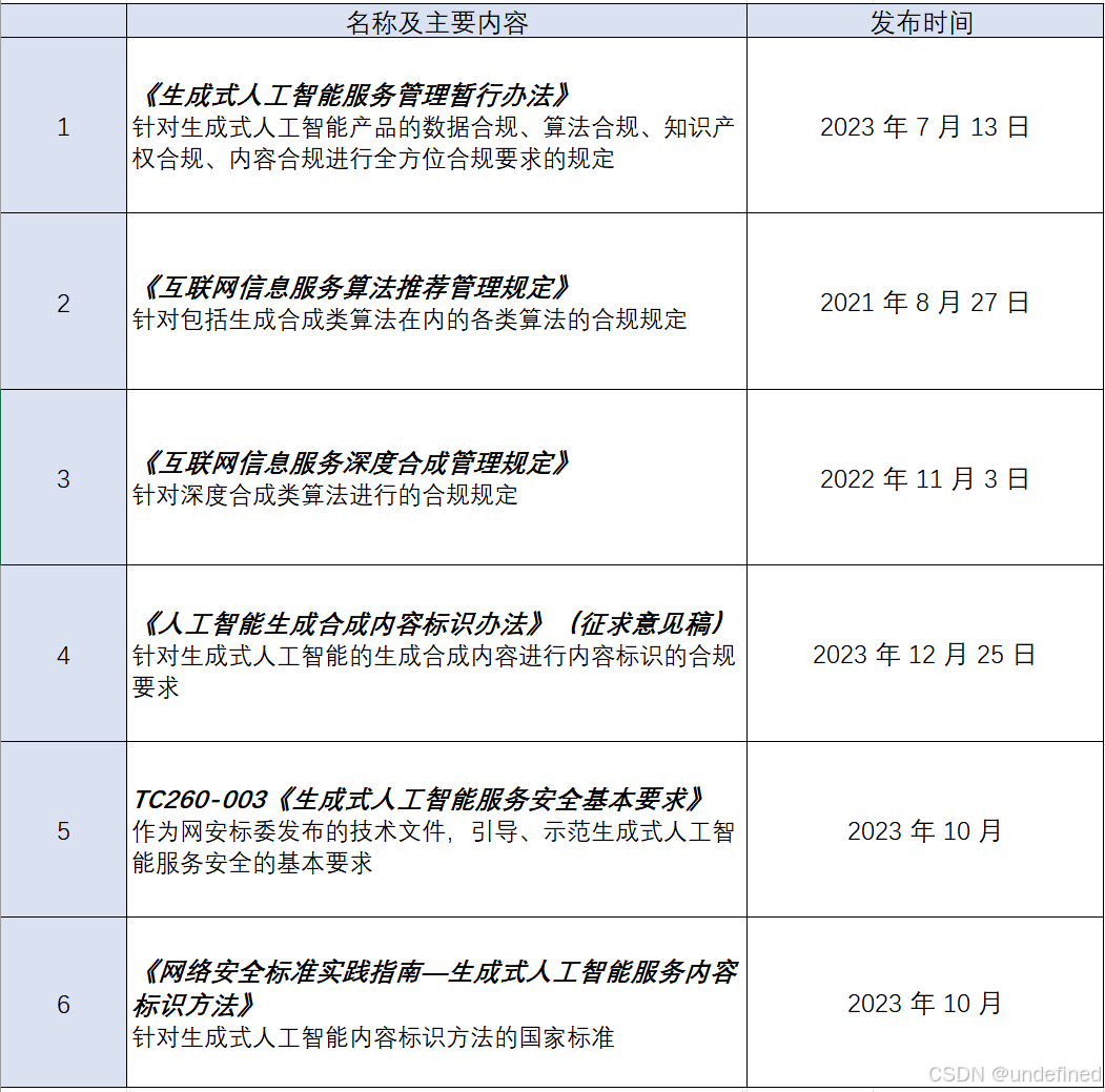 目前我国虽然尚未完成《人工智能法》的制定,但已生效的多部法律法规、国家标准,以及即将出台的重要文件,已针对人工智能领域,尤其是生成式人工智能,提出了全面且完善的监管要求。包括: