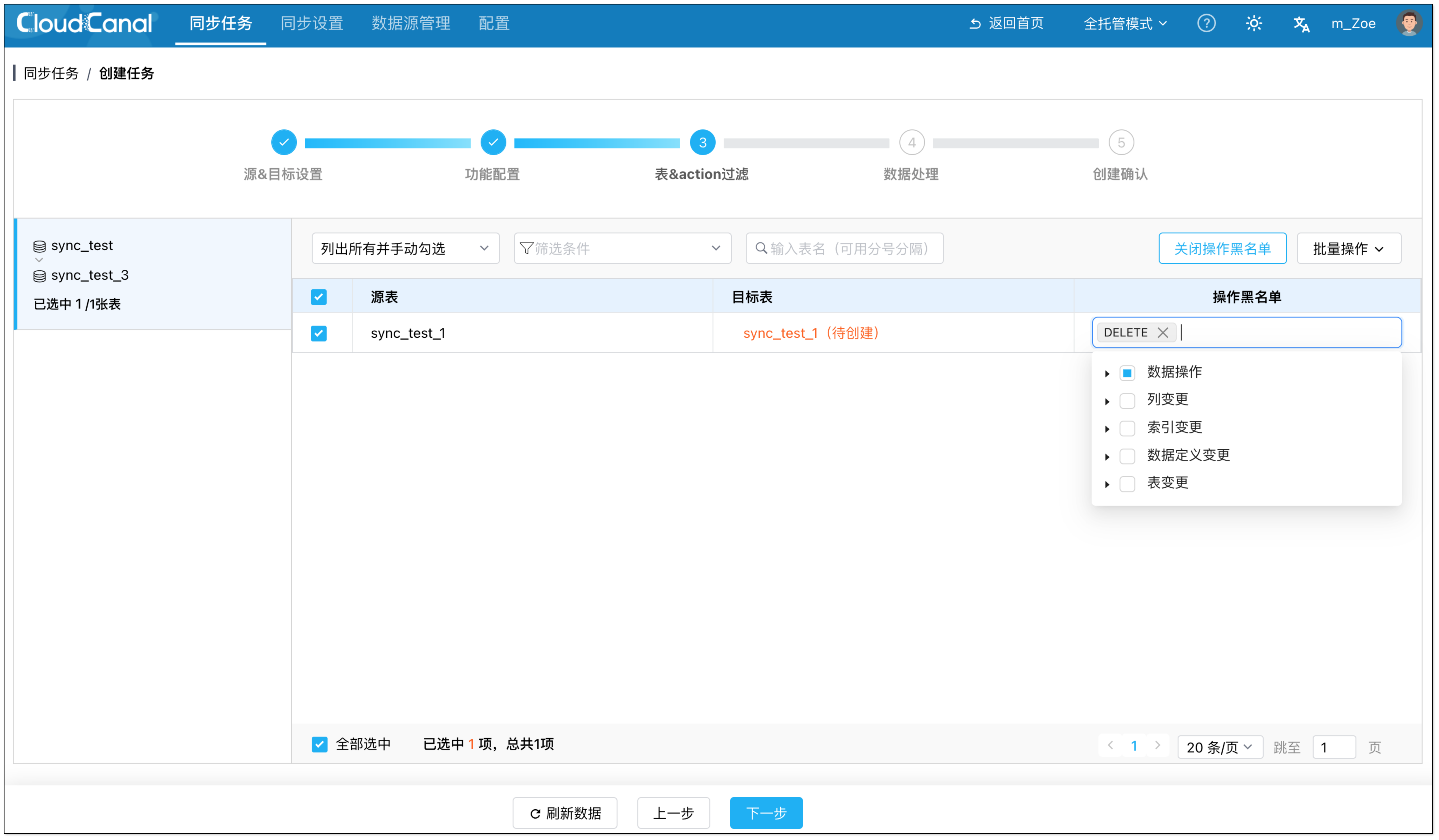 - 在表 & action 过滤页面,选择要迁移的表。可通过打开操作黑名单过滤各类 DDL/DML。
