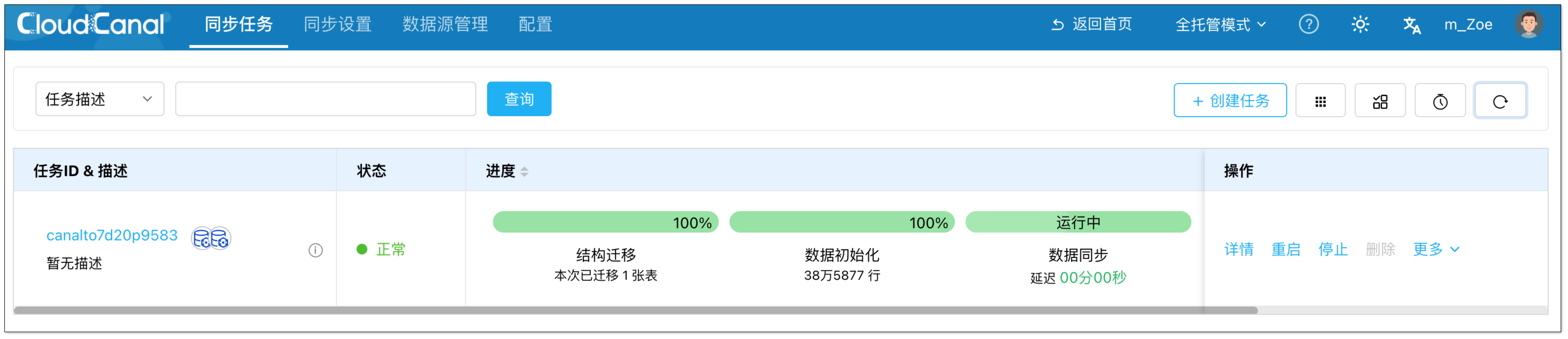 任务启动后,CloudCanal 会自动进行结构迁移、全量迁移、增量同步的任务流转。TDSQL MySQL 中的数据能够实时、准确、高效地流向目标端。