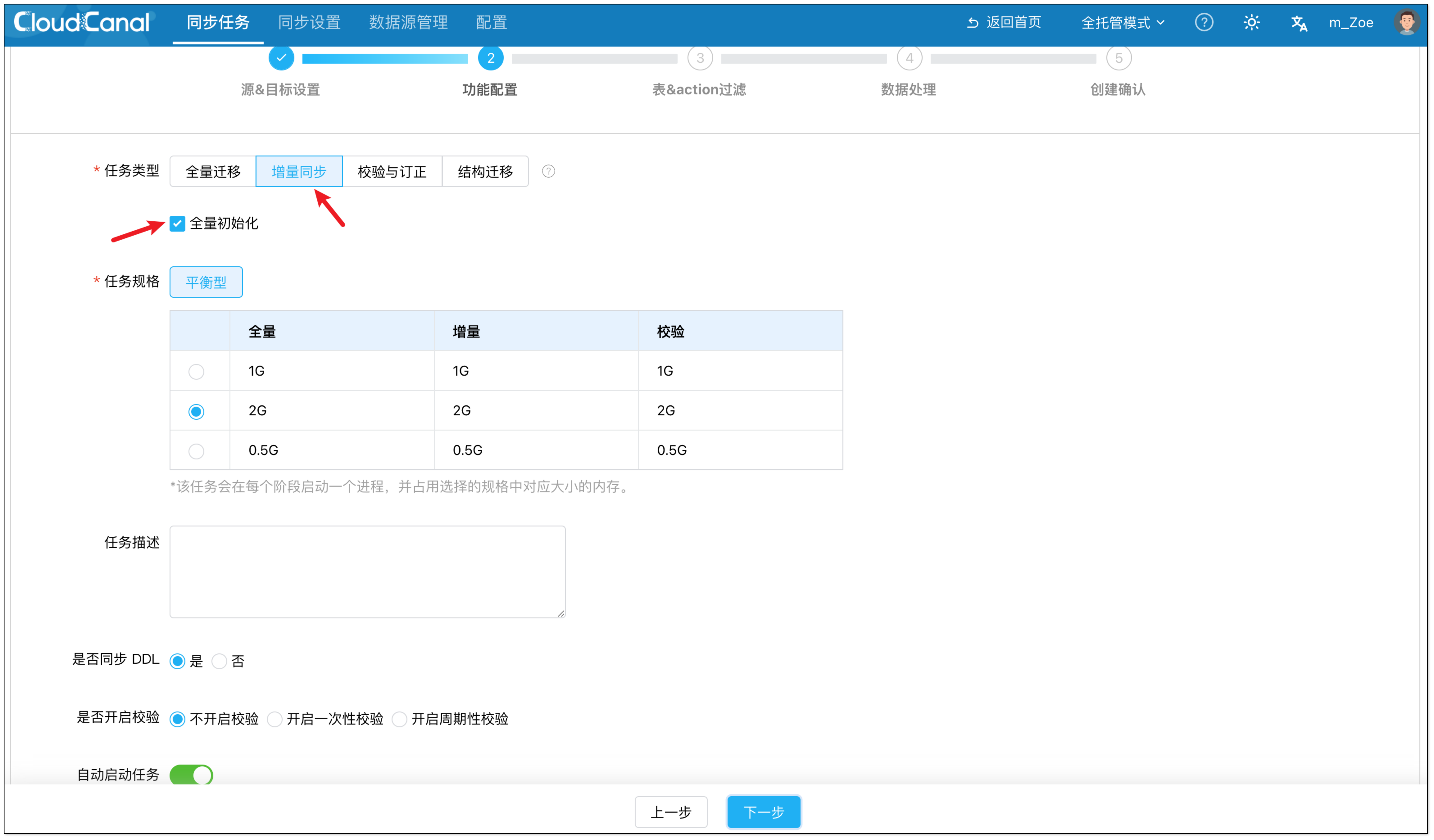 - 在功能配置页面,选择 数据同步 并勾选 全量初始化。