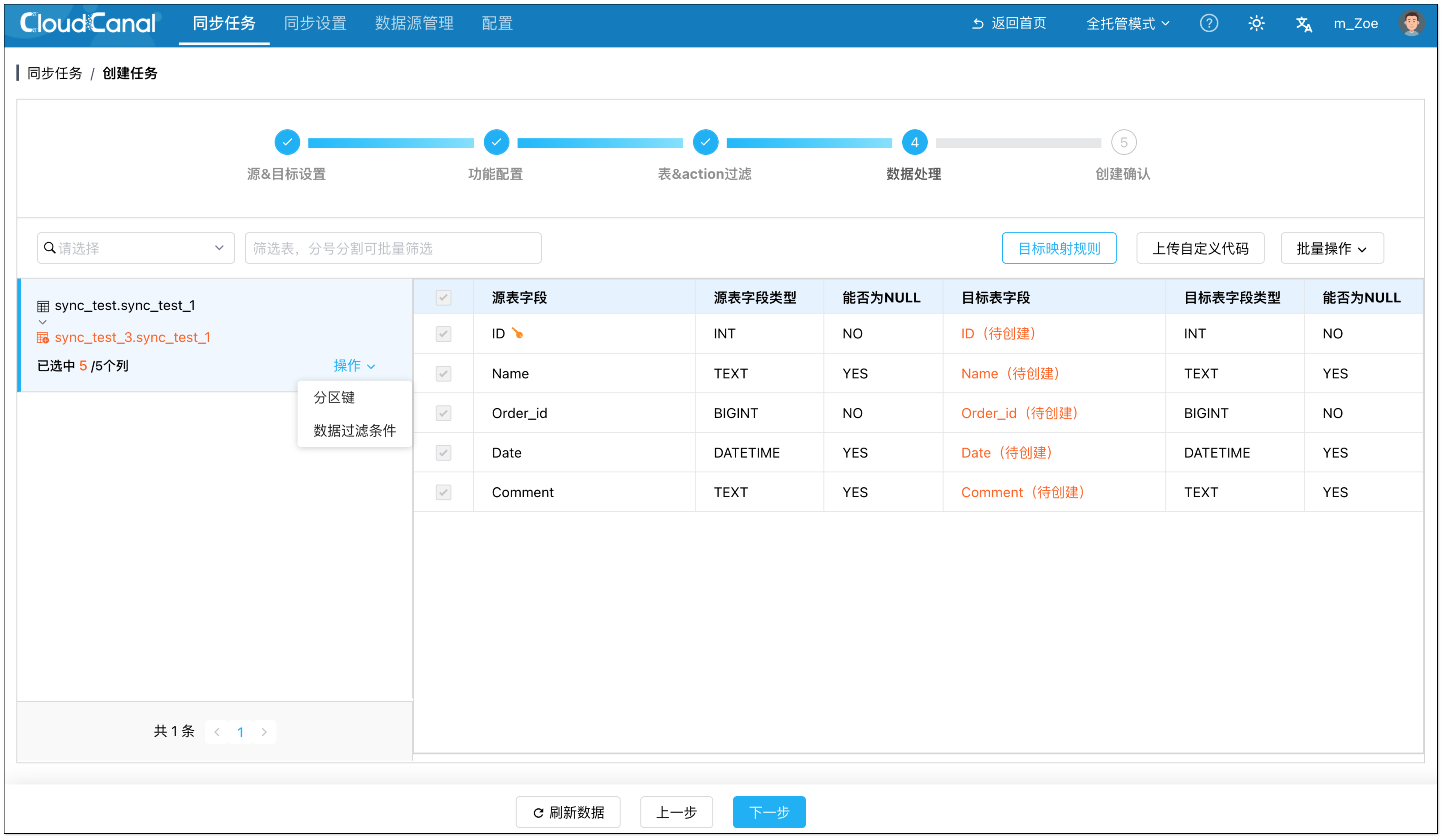- 在数据处理页面,选择要迁移的列。可对数据设置分区键、过滤条件。