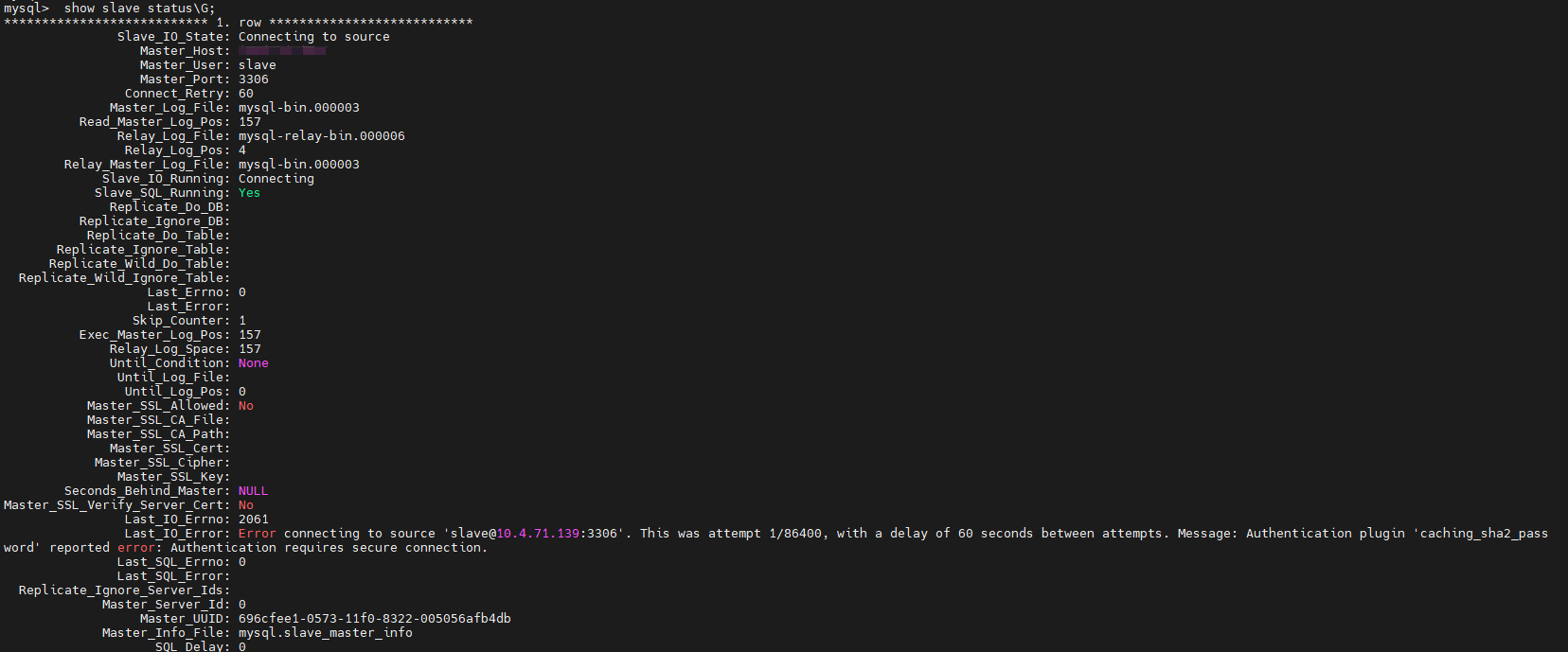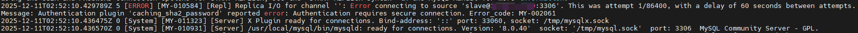 MySQL 从节点在断连后重连时出现 "IO Connecting" 状态,Last_IO_Error 2061,说明 I/O 线程无法成功连接主库进行认证。这通常发生在 MySQL 8.0+ 主库 + 未启用 SSL 的复制连接场景中,具体抛错及日志信息如下: