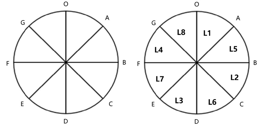随后,t=14ms时L4记录被读取完,磁头到达G点。然后程序开始处理L4,花费1 ms,对应的时间段是从 t=14-15 ms。在 t=15 ms 时点,磁盘在继续旋转,磁头位于GO之间,且还有1ms到达O点。因此,优化分布的结果,本来一定是把记录L5放在OA扇区,但因为OA扇区已有L1,所以一定是把记录L5不得不放在AB扇区(如下图右侧图所示,这里一定要注意!)。1ms后(也就是 t=16ms 时点)磁头到达O点,继续在t=16-18ms 这段时间转到A点。然后开始读取L5,对应的时间段从 t=18-20ms。