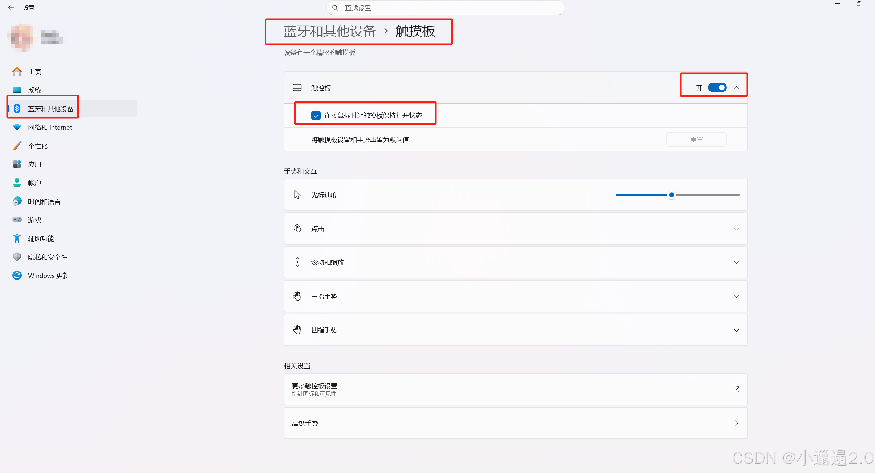 2.找到"蓝牙和其他设备--触摸板" 点击打开,并且勾选"连接鼠标时让触摸板保持打开状态"。