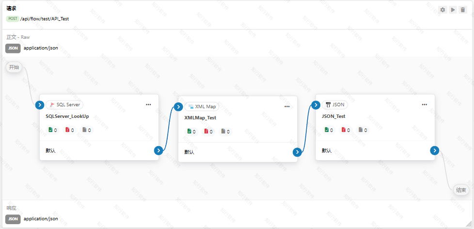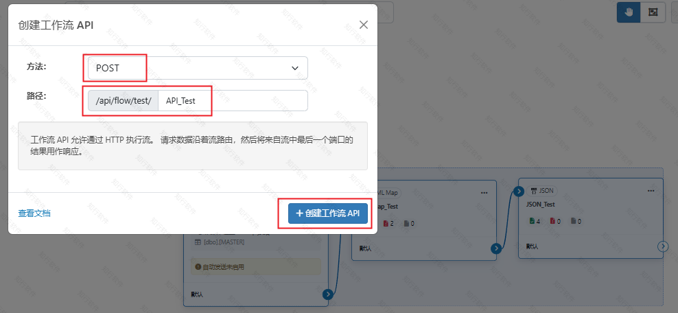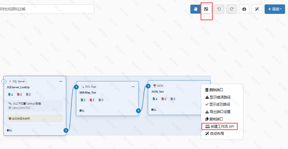 创建Flow API。工作流右上角点击"多选",选中已创建的SQLServer,XMLMap和JSON端口,右键选择"创建工作流API"。