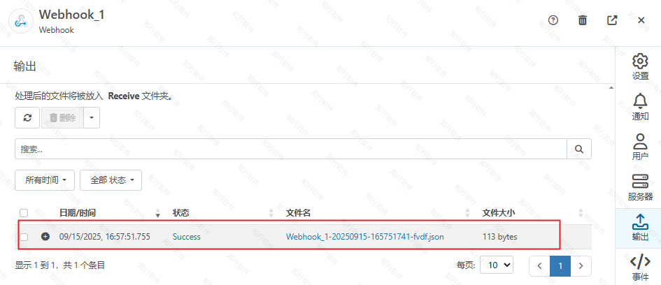在 Postman 中点击 Send 发送请求,文件数据将成功传输至知行之桥平台,并自动显示在 Webhook 端口的输出页面中。