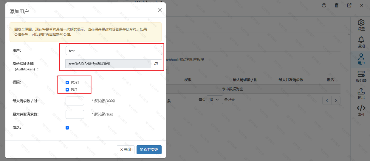 在端口的"用户"页面新建一个用户,系统会自动生成对应的 Authtoken。请根据实际需求,为该用户勾选 POST 或 PUT 操作权限,最后点击"保存变更"完成设置。