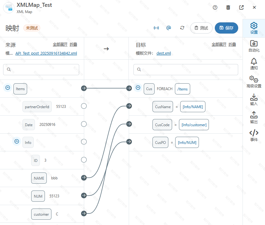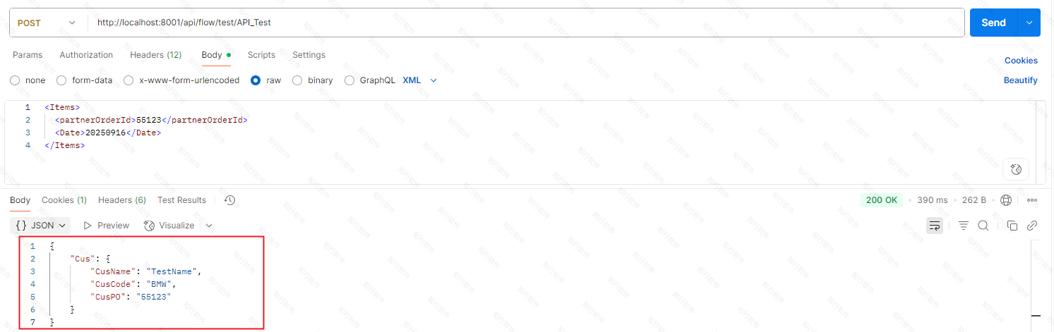 示例场景:通过API接口接收交易伙伴的XML文件,需要根据partnerOrderId的值在内部数据库查询对应的CusName, CusCode和CusPO,并回传指定的JSON文件。