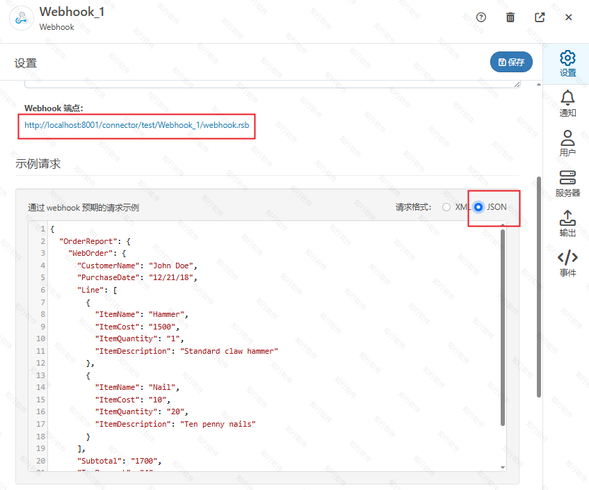 http://localhost:8001/connector/test/Webhook_1/webhook.rsb 其中test是工作区名称,Webhook_1是端口ID。在配置请求格式时,知行之桥提供两种选项:XML和JSON。请根据与交易伙伴约定的文件格式进行选择。如果选择JSON格式,则表示该端口仅接收符合JSON格式规范的数据文件。