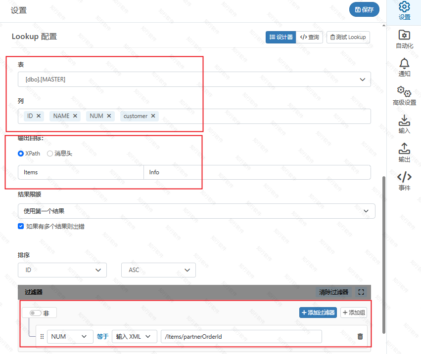 随后在端口上传一份交易伙伴发送的示例XML文件至端口输入界面,以此文件结构作为映射模板。在Lookup配置选项中,指定目标数据库表并从下拉菜单中勾选需要返回的列。最后,在映射视图中,通过从示例XML文件中拖拽合作伙伴业务ID节点(如partnerOrderId)至数据库表对应的列(如NUM),来创建过滤器。此举会自动生成一个等价于WHERE [NUM] = @partnerOrderId的查询条件,确保系统能使用输入文件中的值精准匹配数据库记录。全部配置完成后,指定输出目标即可。