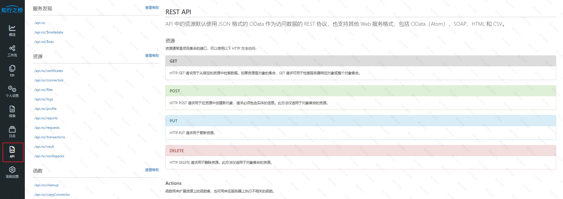 知行之桥内置的系统 API 提供了一种灵活的方式来管理应用程序。在管理控制台用户界面中可以完成的所有操作也可以通过调用 RESTful API 来完成。点击API页面,这里列举了所有API调用的资源和操作示例,用户可按需取用。更多帮助文档请参考