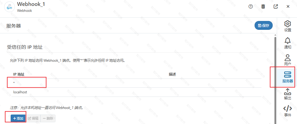在"服务器"页面,"受信任的 IP 地址"栏目中,设置允许访问 Webhook 端点的IP 地址,使用"*"表示允许任何 IP 地址访问。