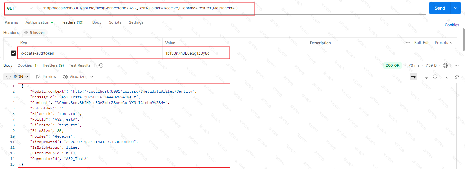 示例场景:获取指定AS2端口Receive目录下某个文件的消息ID,内容等。配置方法为GET,输入URL,指定端口名,目录和文件名。