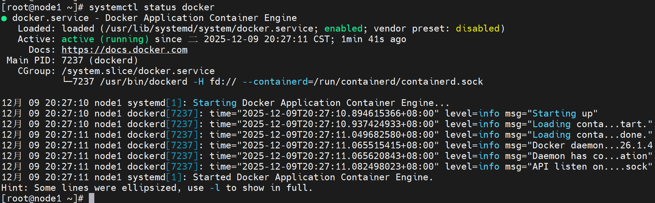 root@node1 \~\]# docker --version Docker version 26.1.4, build 5650f9b \[root@node1 \~\]#
