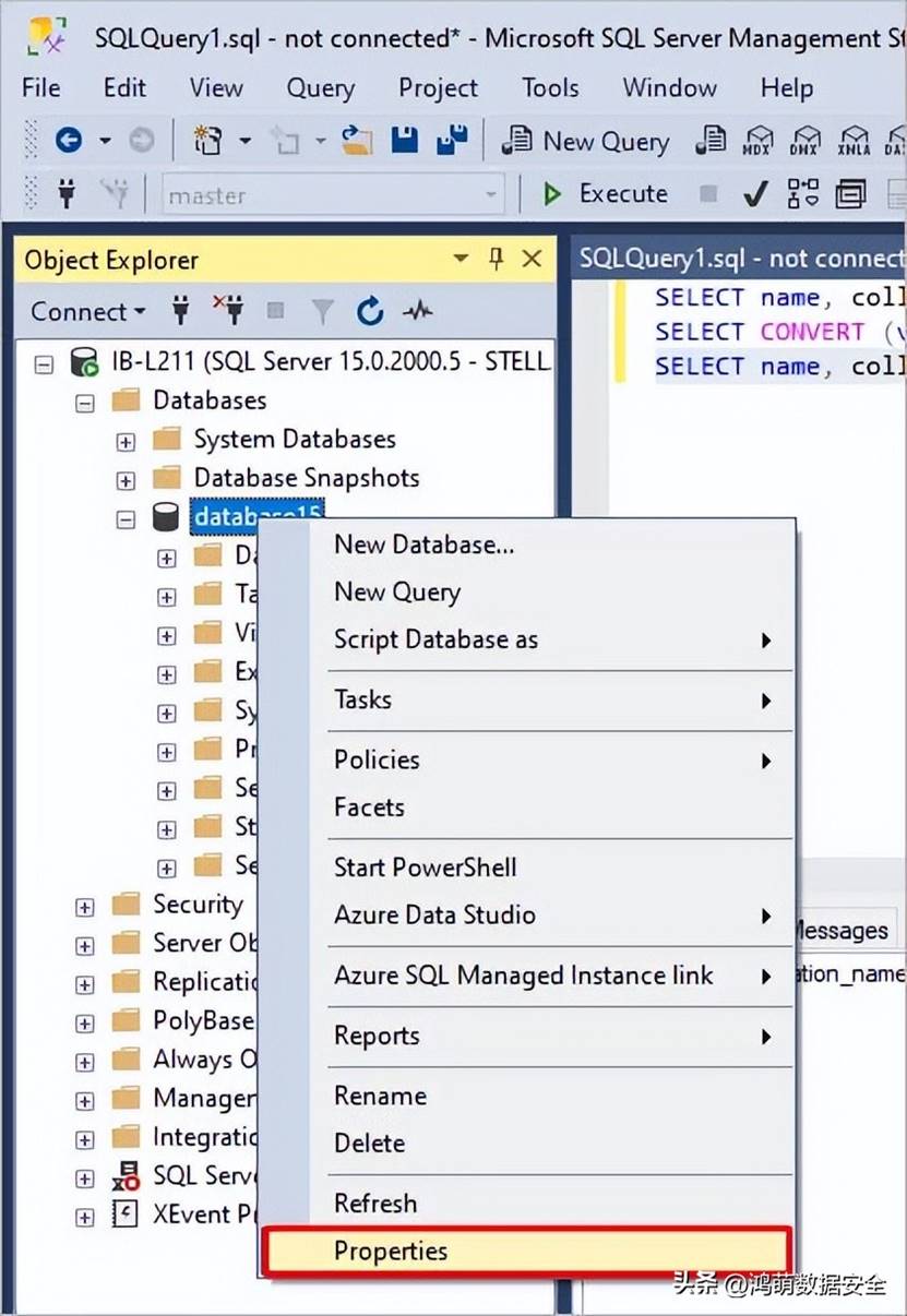 - 右键单击需要更改排序规则的数据库,然后选择"属性"。