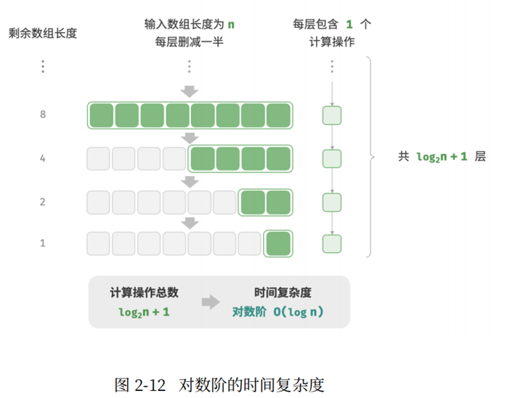 对数阶反映了 "每轮缩减到一半" 的情况。设输入数据大小为n, 由于每轮缩小到一半,因此循环次数为log2n,即2^n 相反数。