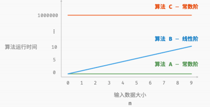 - 算法 C 中的打印操作需要循环 1000000 次,虽然运行时间很长,但它与输入数据大小 𝑛 无关。因此 C的时间复杂度和 A 相同,仍为"常数阶"。