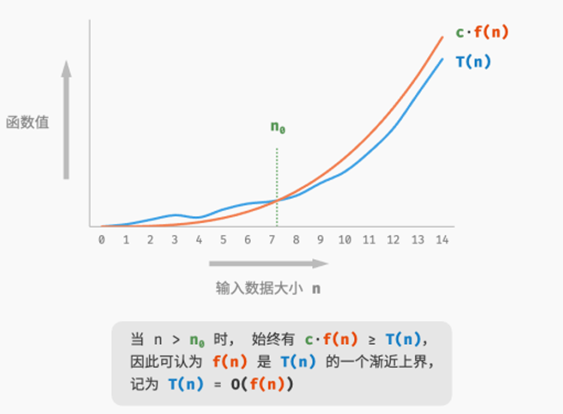 若存在正实数 𝑐 和实数 𝑛0 ,使得对于所有的 𝑛 > 𝑛0 ,均有 𝑇(𝑛) ≤ 𝑐 ⋅ 𝑓(𝑛) ,则可认为 𝑓(𝑛) 给 出了 𝑇(𝑛) 的一个渐近上界,记为 𝑇(𝑛) = 𝑂(𝑓(𝑛)) 。