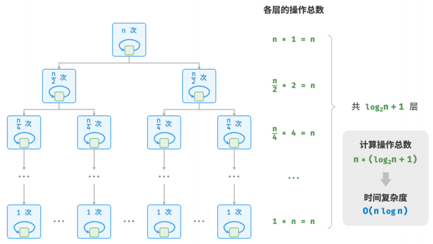 下图展示了线性对数阶的生成方式。二叉树的每一层的操作总数都为 𝑛 ,树共有 log2𝑛 + 1 层,因此时间复杂度为 𝑂(𝑛 log 𝑛) 。