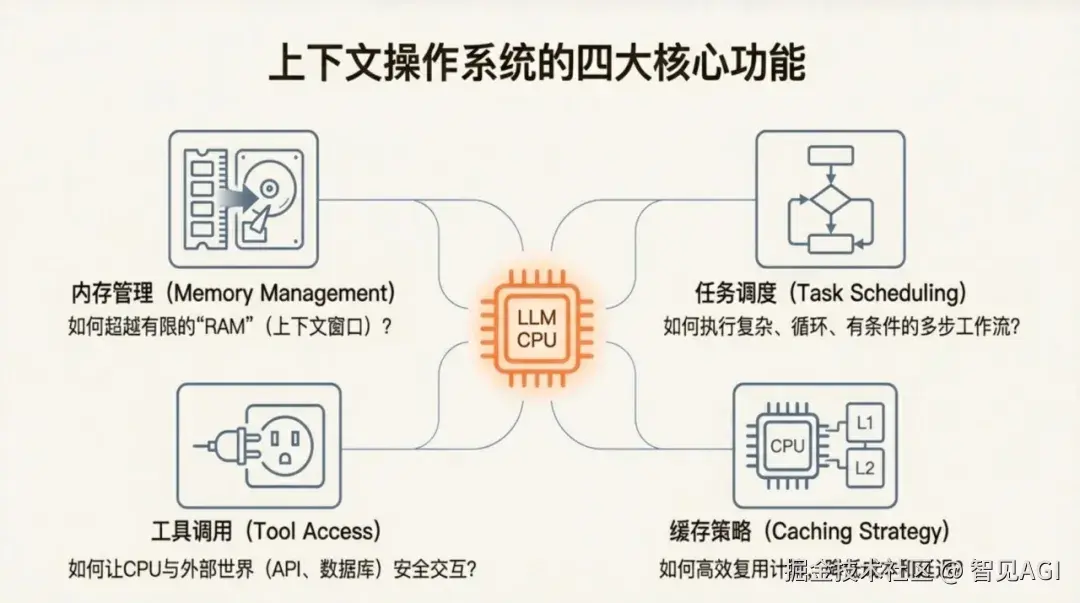 但上下文工程完全不同。它将LLM视为CPU,上下文窗口视为RAM,而我们要做的,是为这个CPU设计一个完整的操作系统------管理它的内存、调度它的任务、优化它的缓存、控制它的外部交互。这是一门真正的"工程学科"。在这个新范式里,提示词只是整个系统的一个微小组件。真正的挑战在于:当上下文窗口只有128K的"RAM",而外部知识库是100TB的"硬盘"时,你如何设计虚拟内存系统?当用户请求从简单的问答变为"分析过去一年的销售数据,对比三个竞品,生成报告并发送给团队"时,你如何设计多进程调度?当API调用成本随上下文长度指数增长时,你如何设计缓存策略?当敏感数据需要跨会话记忆时,你如何设计权限隔离?这些问题,才是上下文工程的核心。