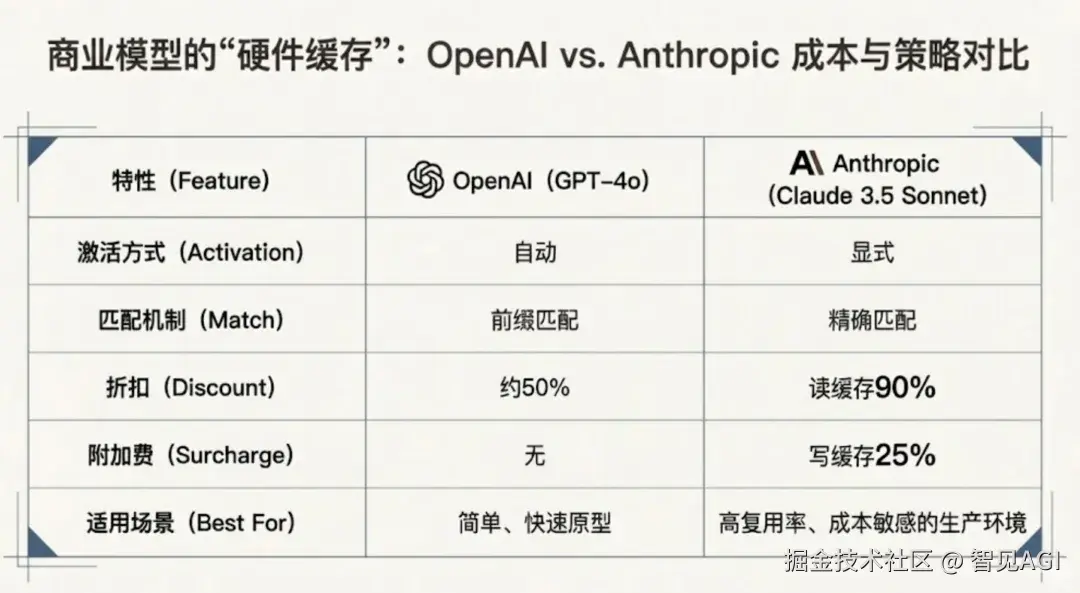 OpenAI:自动缓存,精确匹配,读缓存50%折扣,适合简单原型。它的缓存像CPU的L1 Cache,完全自动但命中率有限------只有完全相同的请求前缀才能命中。