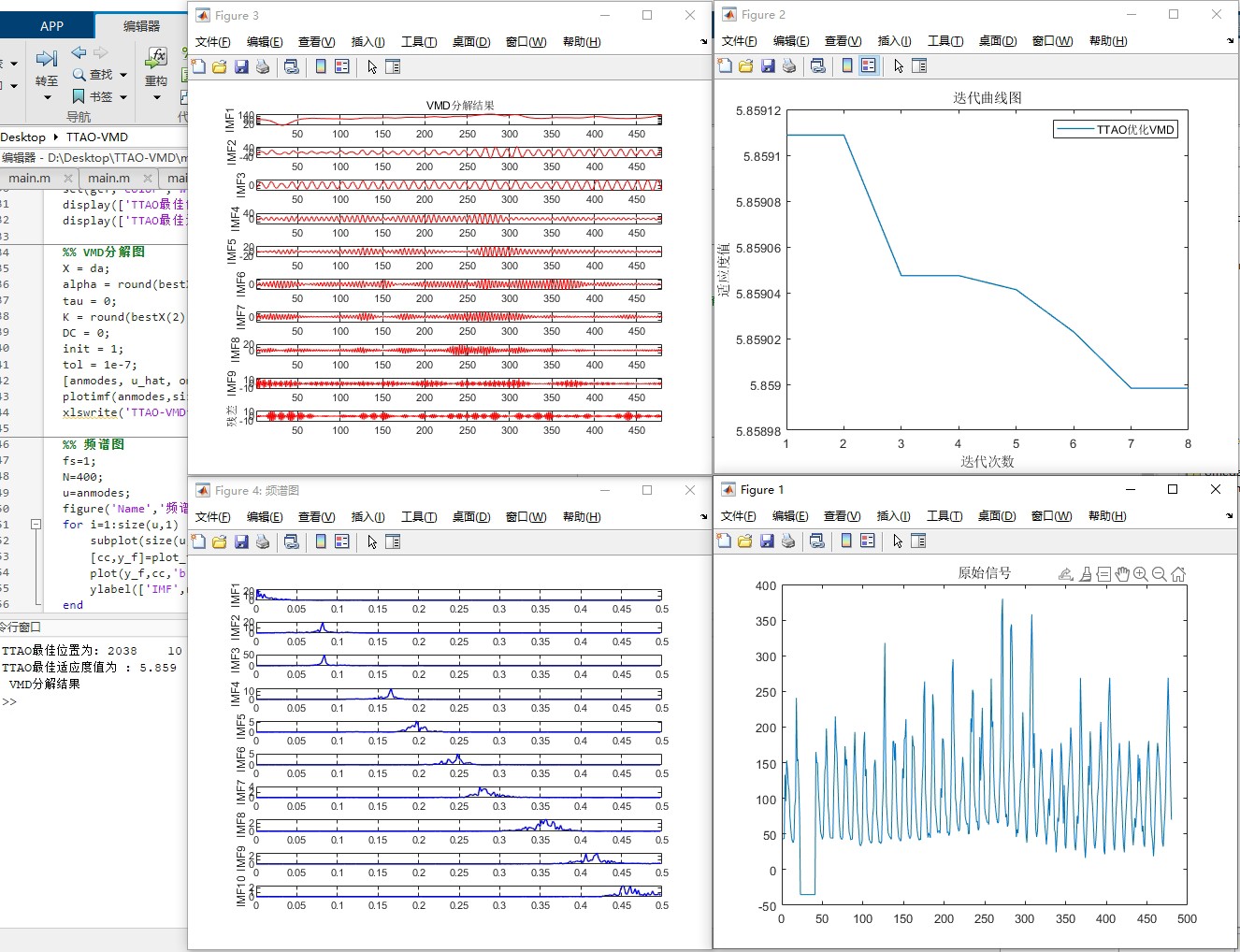 这段代码首先初始化了TTAO算法的一些参数,比如种群大小 popsize**和最大迭代次数 max iter ,然后调用 TTAO 函数(这里假设已有定义)利用适应度函数对VMD的参数 k 和 a 进行优化,得到最优参数后再次进行VMD分解,并绘制出各种效果图。