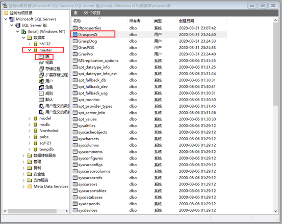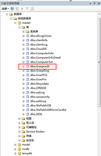 2、依次点开,右键点击然后选择 master 数据,选择"表",在出现的表中选择 graspcwzt,键点击此表选择返回所有行。