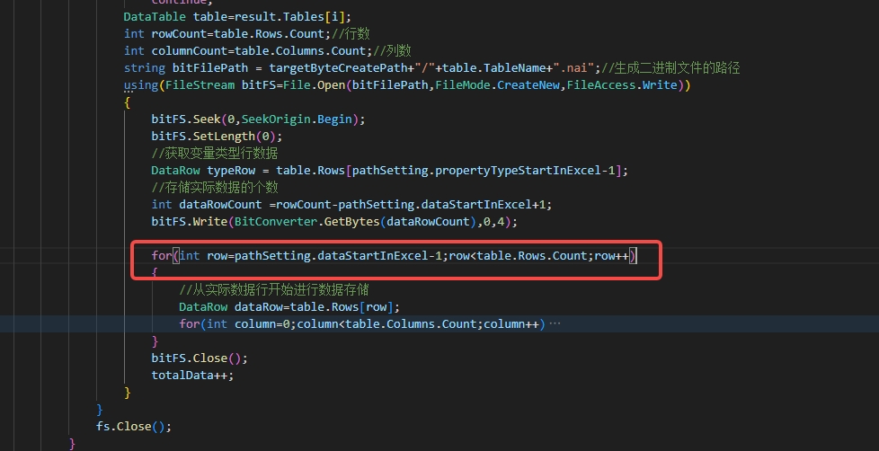 for(int row=pathSetting.dataStartInExcel-1;row<table.Rows.Count;row++)