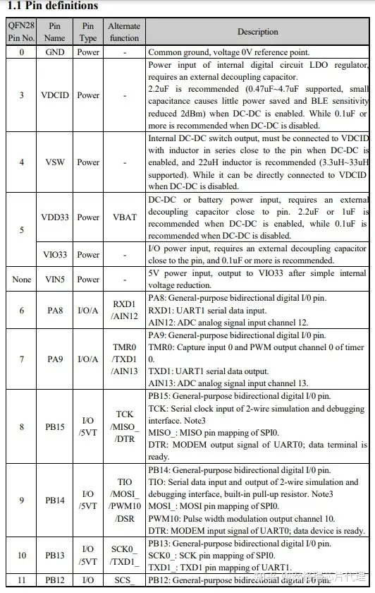 采用QFN28封装,提供22个GPIO,部分支持5V输入,并集成DC-DC转换器以降低功耗