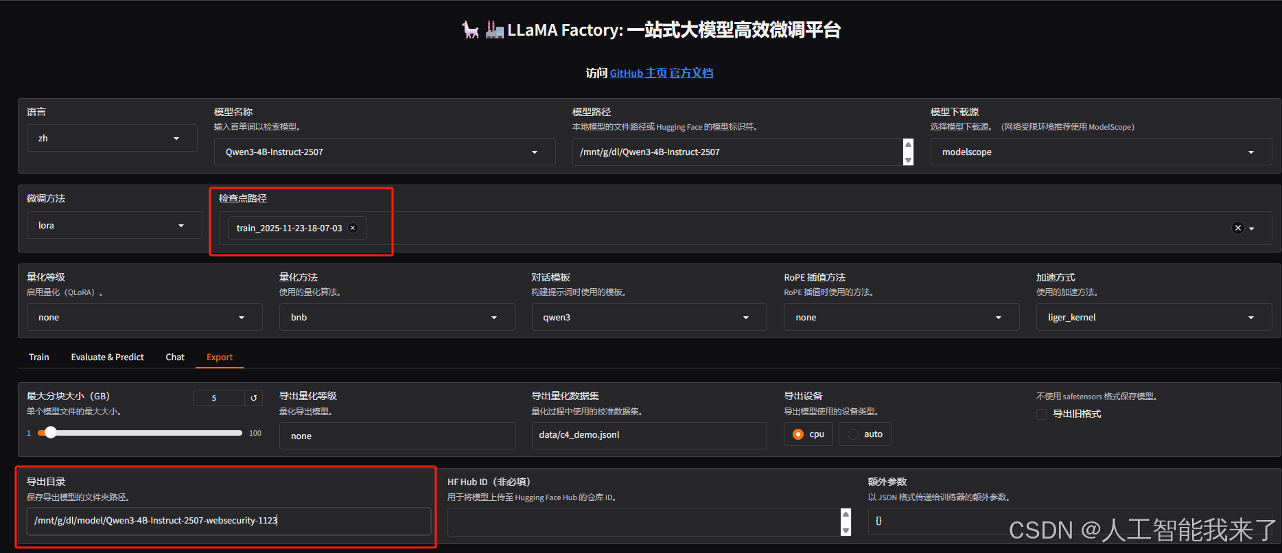 我们重新把微调输出目录填入检查点路径,然后重新加载模型,并设定一个导出目录(这里可以设定模型输出后的量化等级、以及一键上传 Hugging Face 等等,大家可以选择设置):