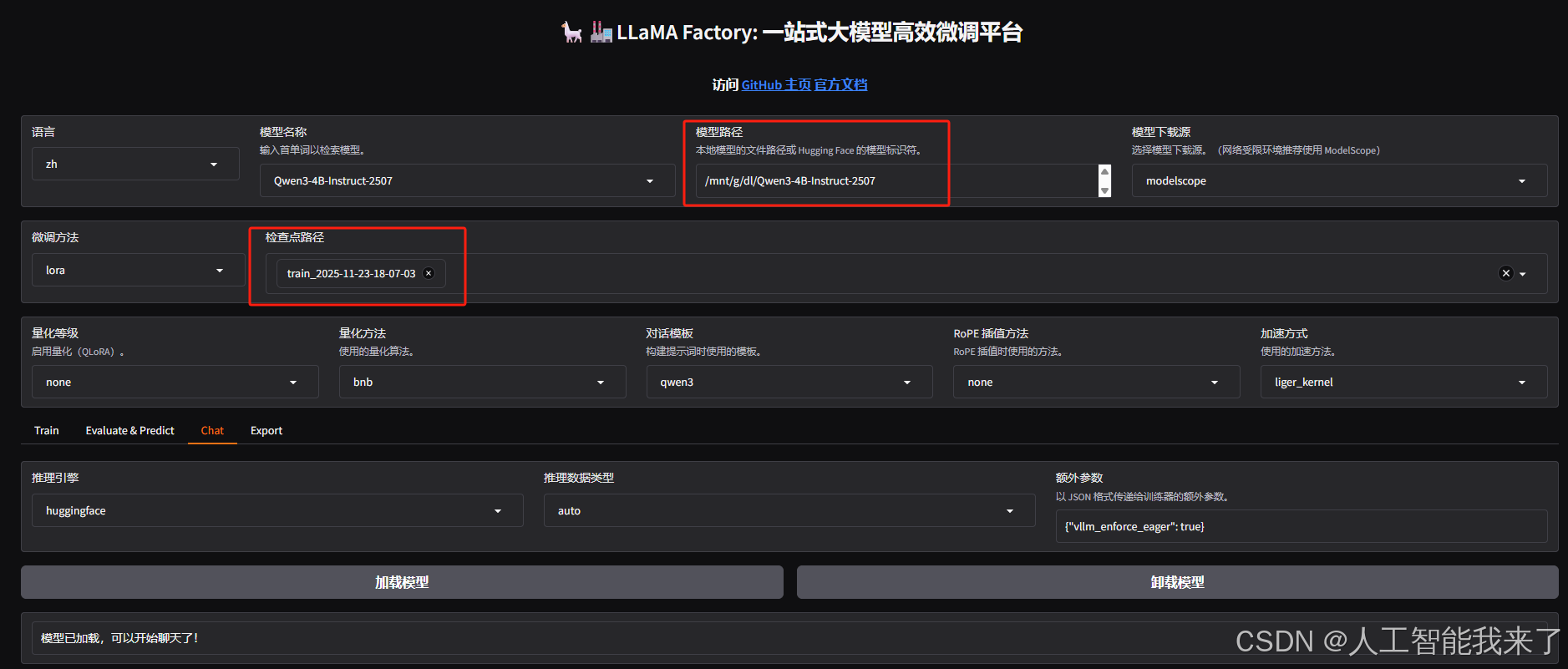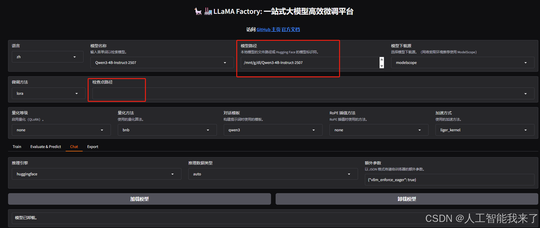 下面,我们可能想快速对微调后的模型效果进行简单的验证,可以在 Webui 中通过检查点路径,加载这个适配器,并且重新加载模型,注意检查点路径填写微调后的输出目录,模型路径还填写微调前基础模型的路径: