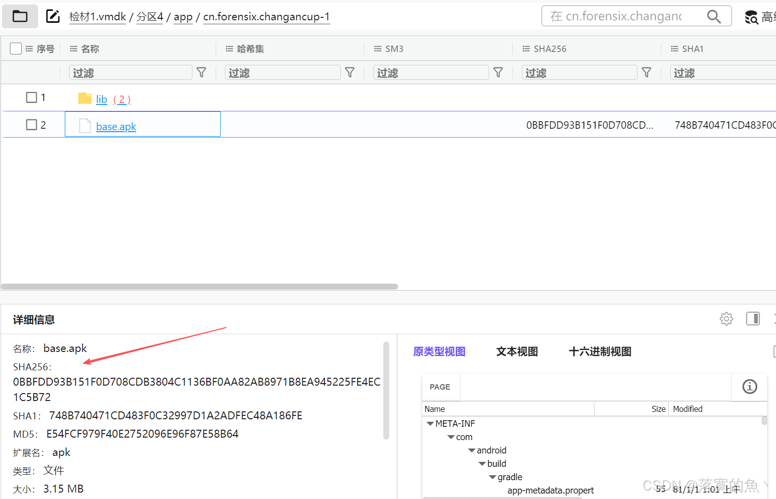 3、提取检材中 cn.forensix.changancup-1包下的apk程序,并计算SHA256值,以此作为flag 提交。