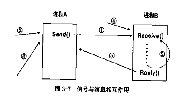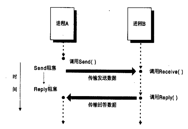 图 3-1 表明所发生的一个简单的事件序列:两个进程(进程 A 和进程 B)使用 Send ()、Receive () 和 Reply () 相互进行通信。