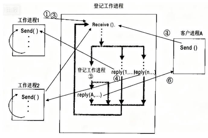 - 工作进程执行的结果用 Send () 发送给服务器进程,服务器进程再登记该工作进程。该工作进程又处于等待回答的阻塞状态。