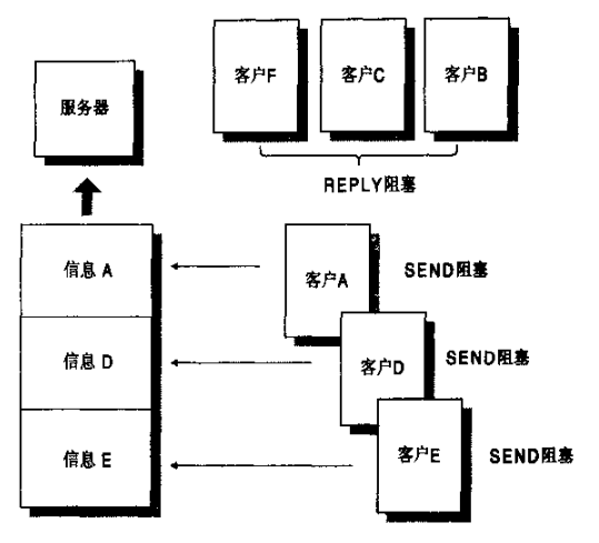 上述的消息发送、接收、回答刻划了一个典型的客户 / 服务器的结构,发送消息的进程(进程 A)是一个客户进程,接收、回答的进程(进程 B)是一个服务器进程。