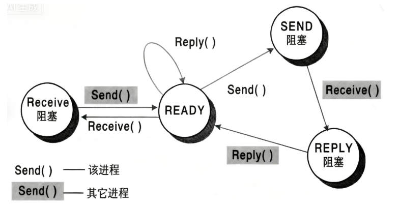 - 进程 A 通过发送 Send 请求向进程 B 发送了一条消息。这时,进程 A 进入 Send 后的 SEND 阻塞状态,直到进程 B 调用了 Receive () 来接收消息。