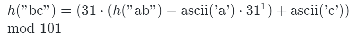 为了使哈希函数支持滚动计算,我们需要在常数时间内从前一个哈希值计算出下一个哈希值。