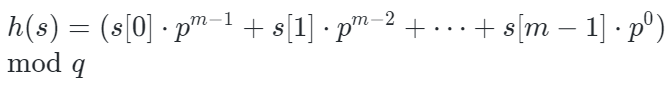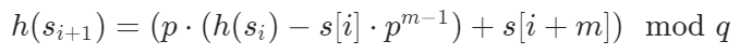h(si)是当前子串的哈希值。 s[i]是当前子串的第一个字符的 ASCII 值。 s[i+m]是下一个子串的最后一个字符的 ASCII 值。