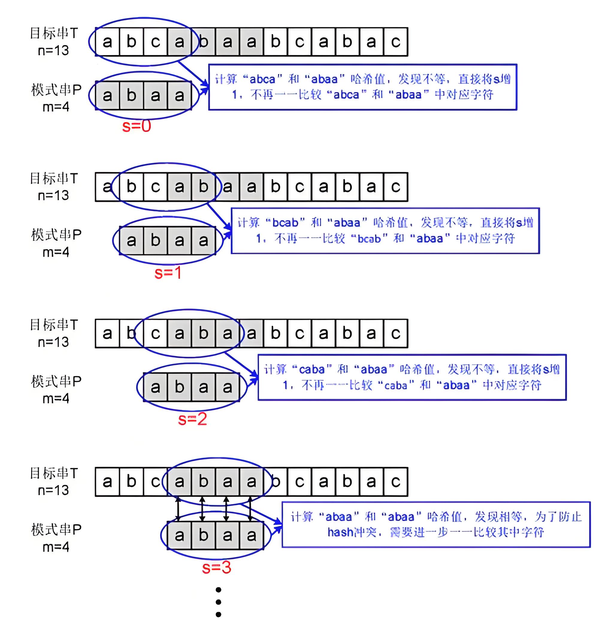 - 比较哈希值:将模式的哈希值与文本中每个子串的哈希值进行比较。如果哈希值相等,再进一步检查模式和子串是否确实匹配。