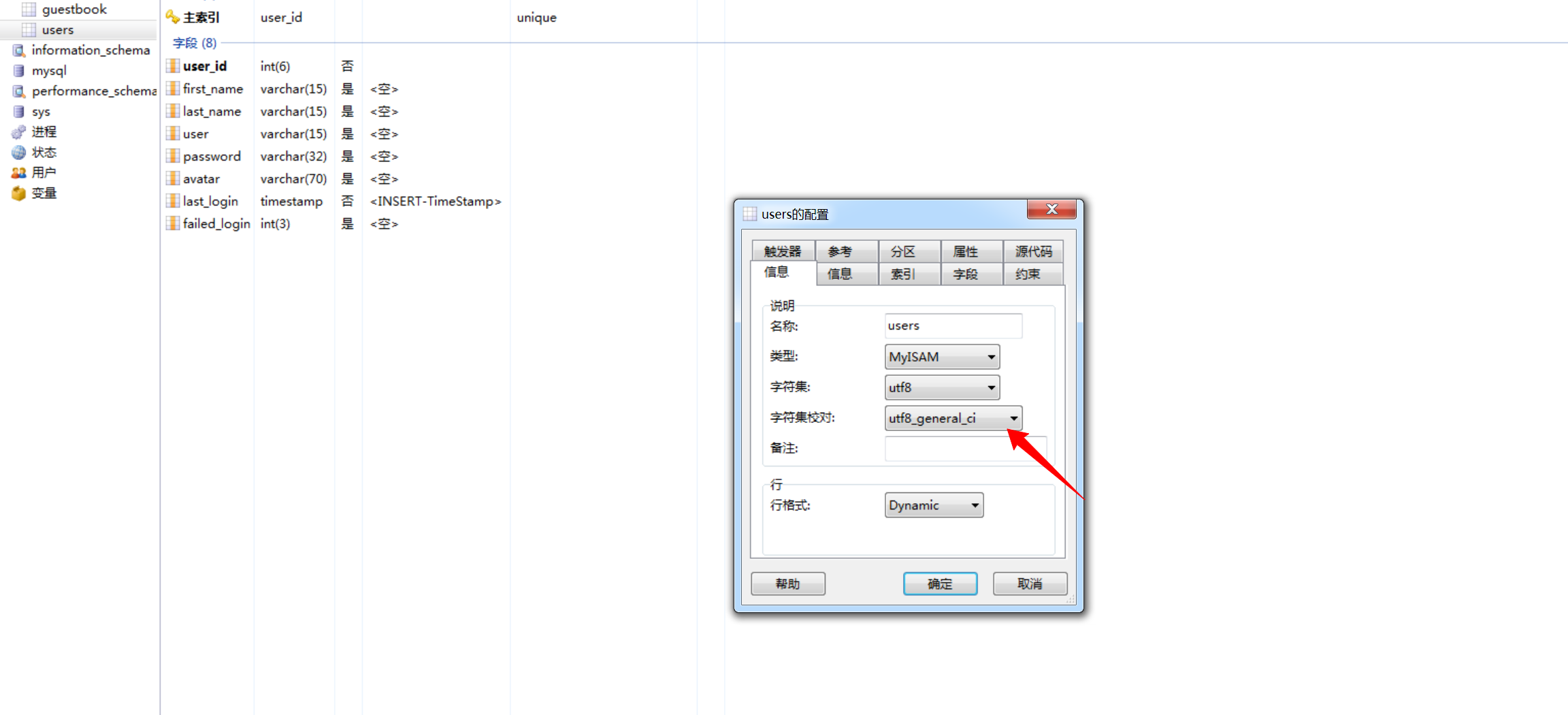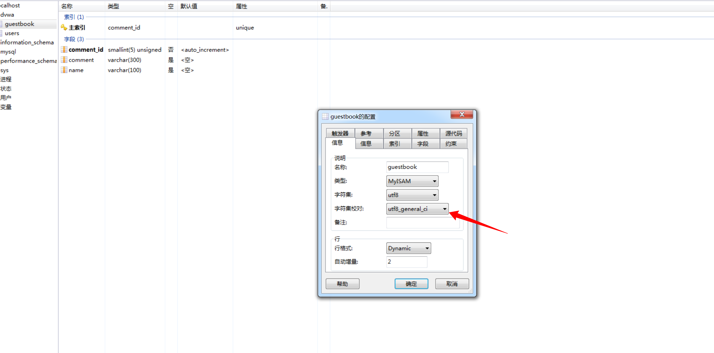 5.系统初始化之后使用 SQL_Front 工具修改 dvwa 库下两个表的字符集校对为 utf8_general_ci ,防止后续出现乱码