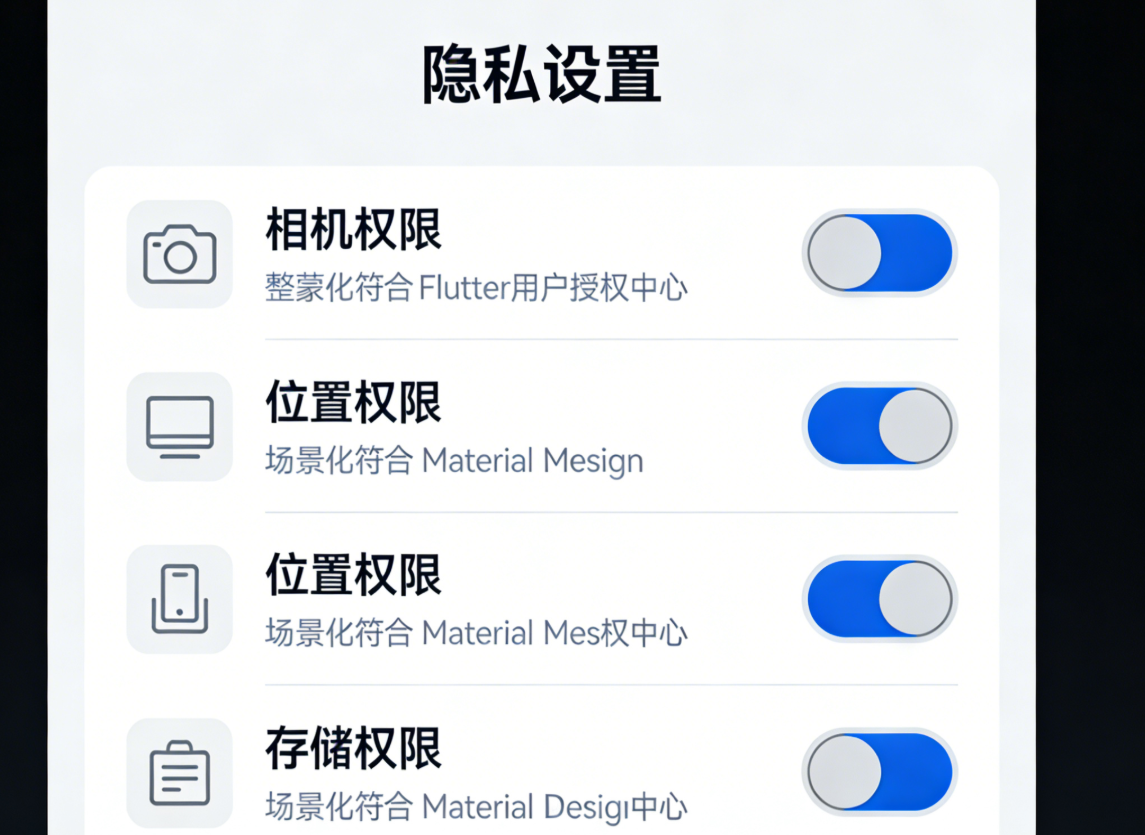用户授权中心是隐私合规的核心入口,需实现 "按需申请、场景化说明、授权可撤回" 三大功能,完全遵循鸿蒙权限管控规范与 Flutter 跨端适配要求。