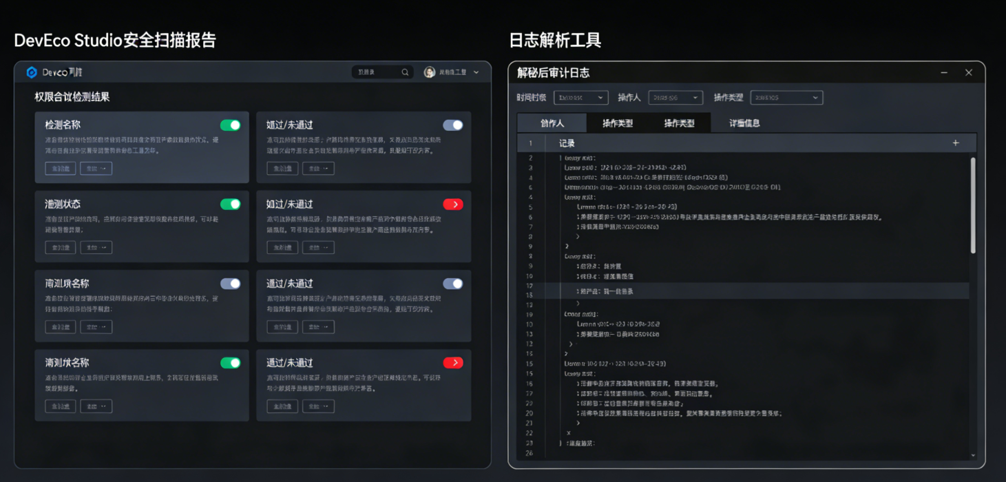 - 合规工具:DevEco Security Scanner、dart_secrets_scanner 1.0.6、Hilogtool 日志解析工具。