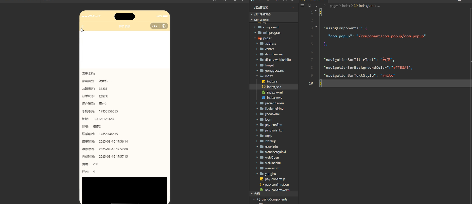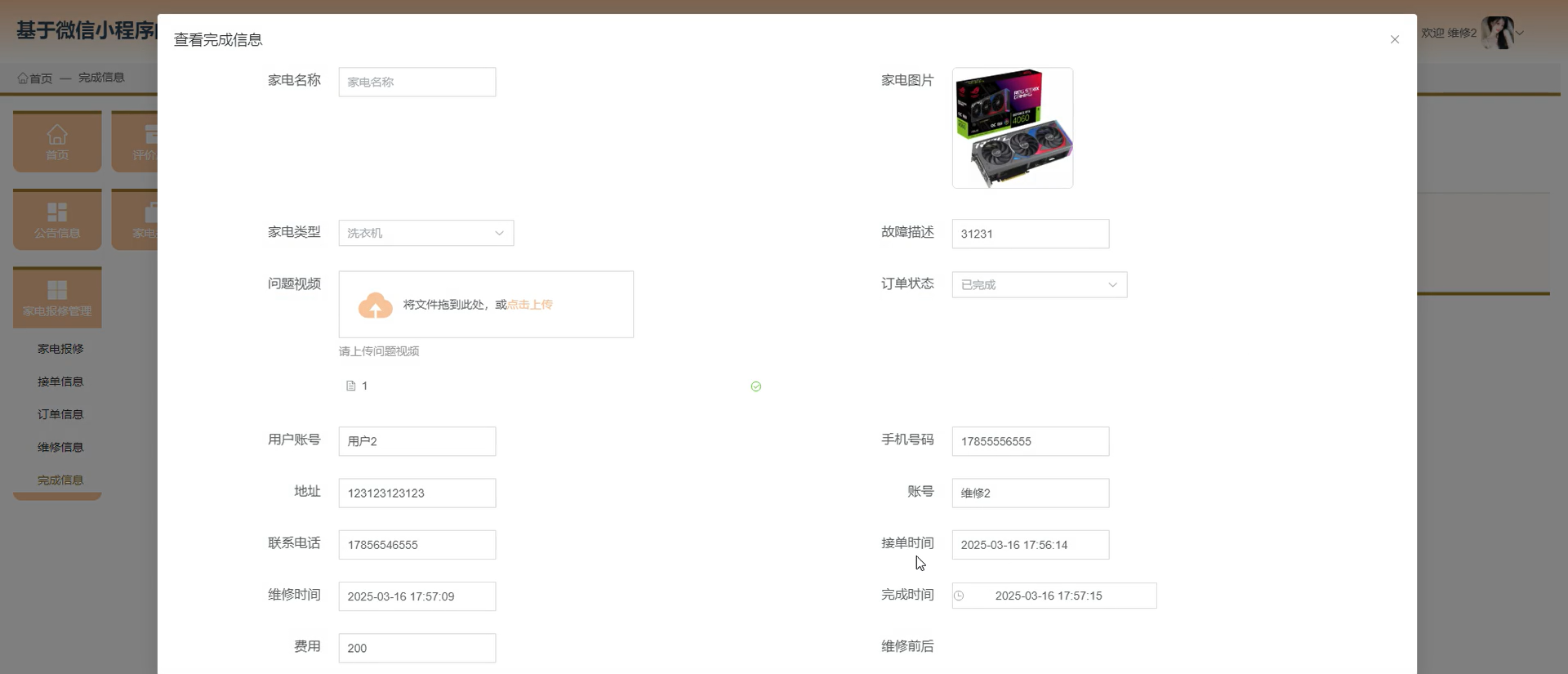- 维修师傅模块:注册登录、订单管理、评价查看与回复;