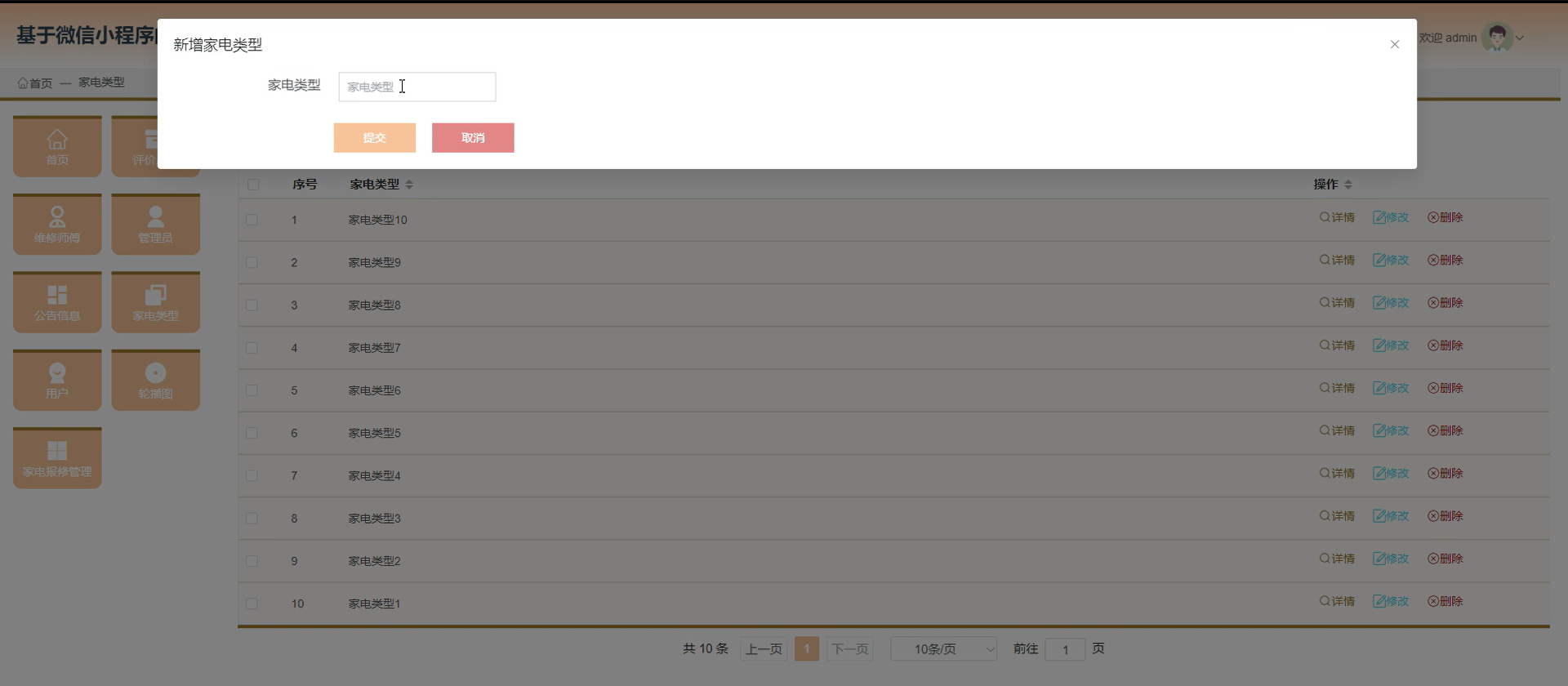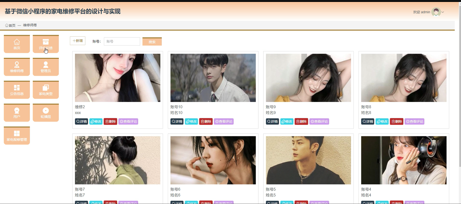 - 核心功能:用户信息管理(审核、禁用、删除)、维修师傅资质审核与信息管理、评价反馈监控(处理投诉、争议)、家电类型管理(新增、修改、删除分类)、订单状态监督。