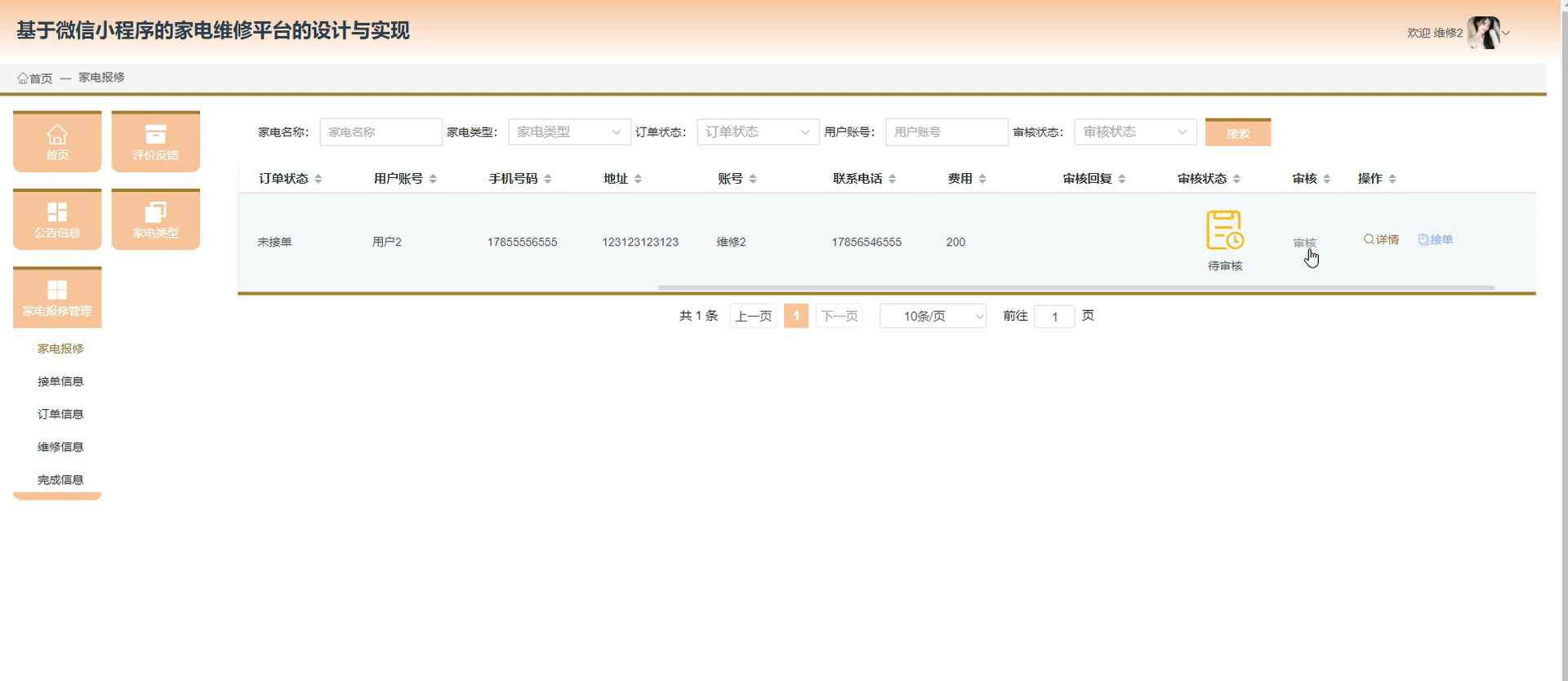 随着居民生活水平提升与家用电器普及,家电维修服务的市场需求持续增长,但传统维修模式存在显著痛点:信息不对称导致用户难以筛选优质维修资源、服务质量缺乏统一标准且稳定性差、报修流程繁琐、维修进度不透明,整体用户体验不佳。同时,微信小程序凭借 "无需下载、即开即用" 的特性及庞大的用户基础,成为连接用户与服务的高效载体。在此背景下,为解决传统家电维修行业的痛点,满足现代家庭对高效、便捷、透明维修服务的需求,设计并实现基于微信小程序的家电维修平台,通过数字化手段重构维修服务流程,兼具实用价值与行业革新意义。