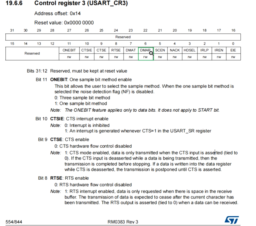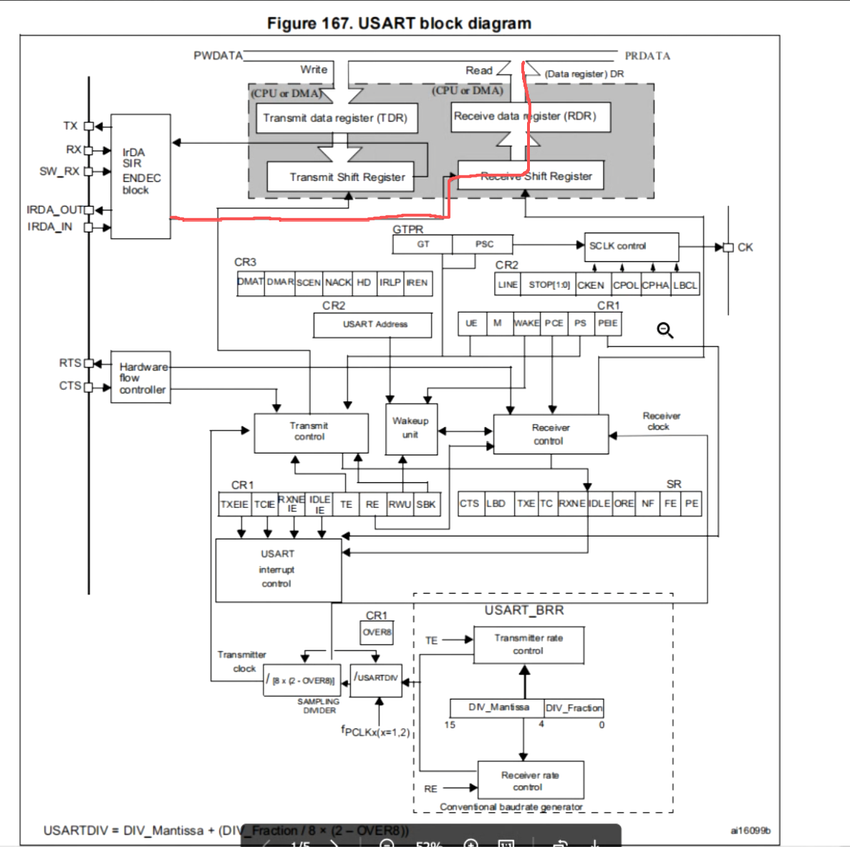 当通信的设备i传来数据时 , RX引脚会接受到数据 , 然后数据被寄存器传输到Data register 寄存器,等待CPU或者DMA将数据取走