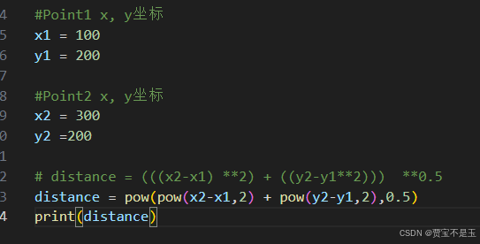 distance = (pow(x2-x1,2) + pow(y2-y1,2)) **0.5
