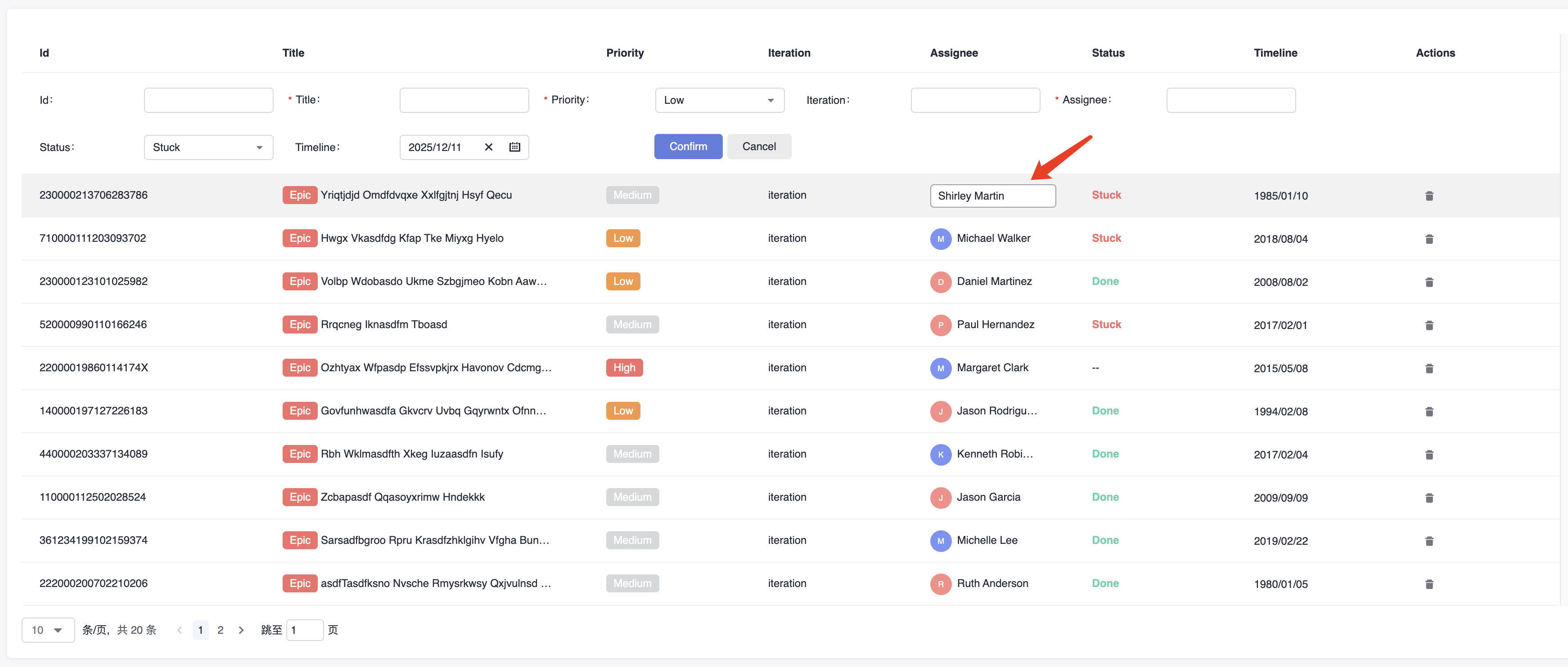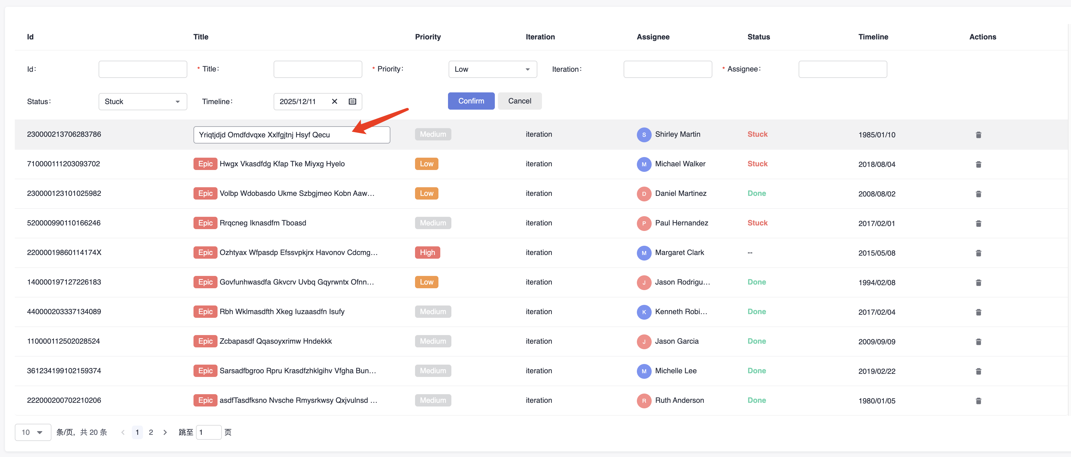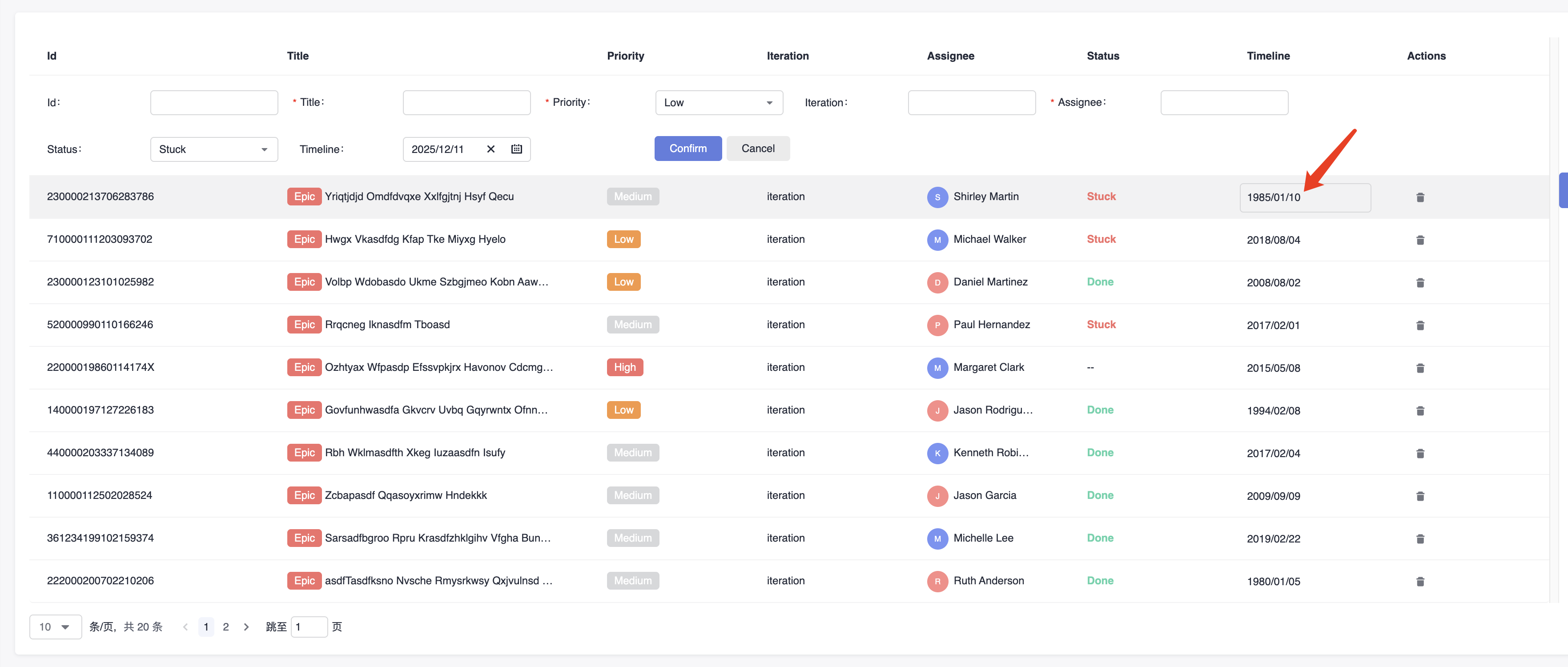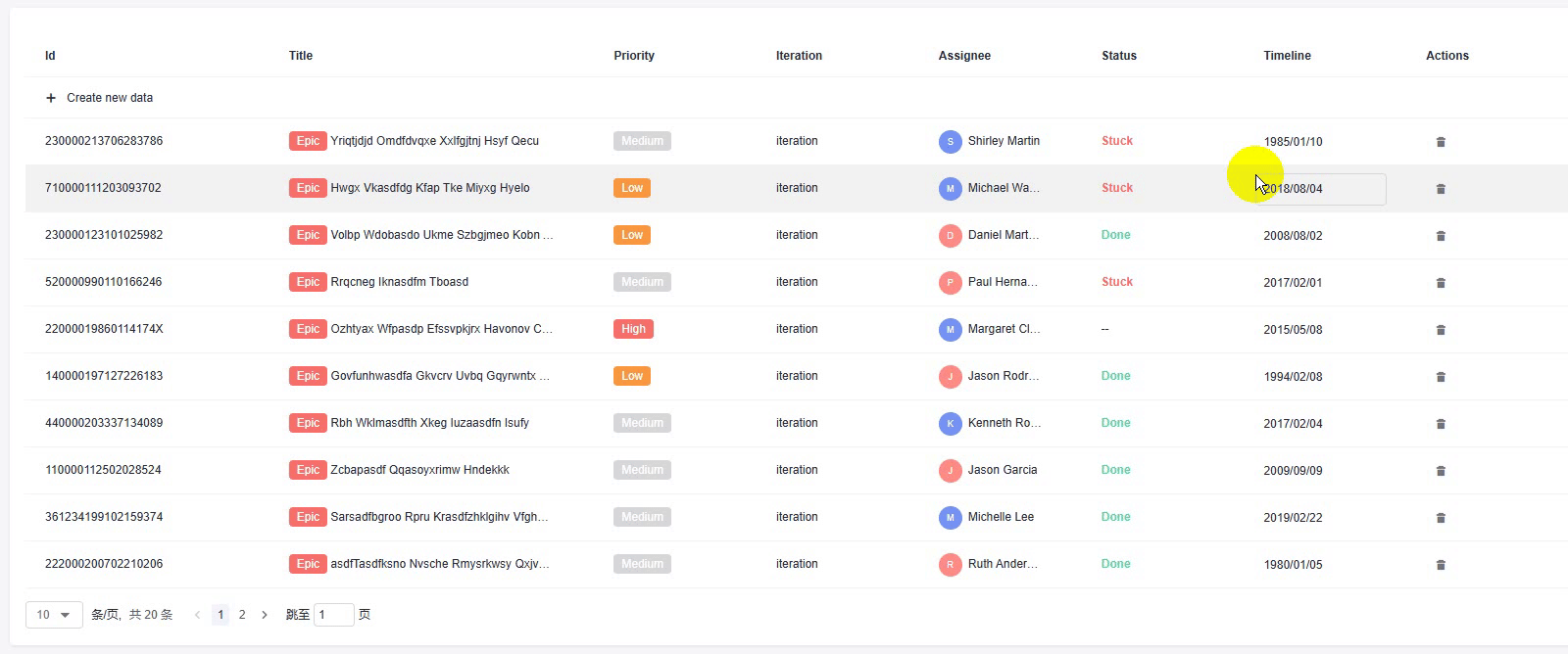 定义了8列表头:ID、标题、优先级、迭代、负责人、状态、时间线、操作
